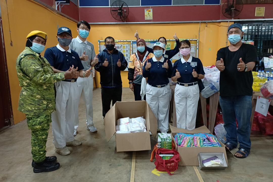 慈济居銮联络处发放的物资除了一般的饮料、面包干粮、生活用品外,另有纸尿片、奶粉、口罩及洗手液予有需要的灾黎。其中一个疏散中心暂住了一位行动不便的老婆婆,在中心官员的要求下,志工送去了一台轮椅。由于新冠病毒疫情仍未受控,所有的疏散中心严守隔离措施。所以志工只能把物资交予中心的负责官员签收,无法像往常亲手布施及慰问灾民们。隔日,志工再回到疏散中心,官员向志工提出支援,希望能为灾民们准备一些生活用品。志工立即动员,分批到附近商店采购,并召集几位志工在环保站分配好各中心需要的生活用品,送到中心给灾民们。