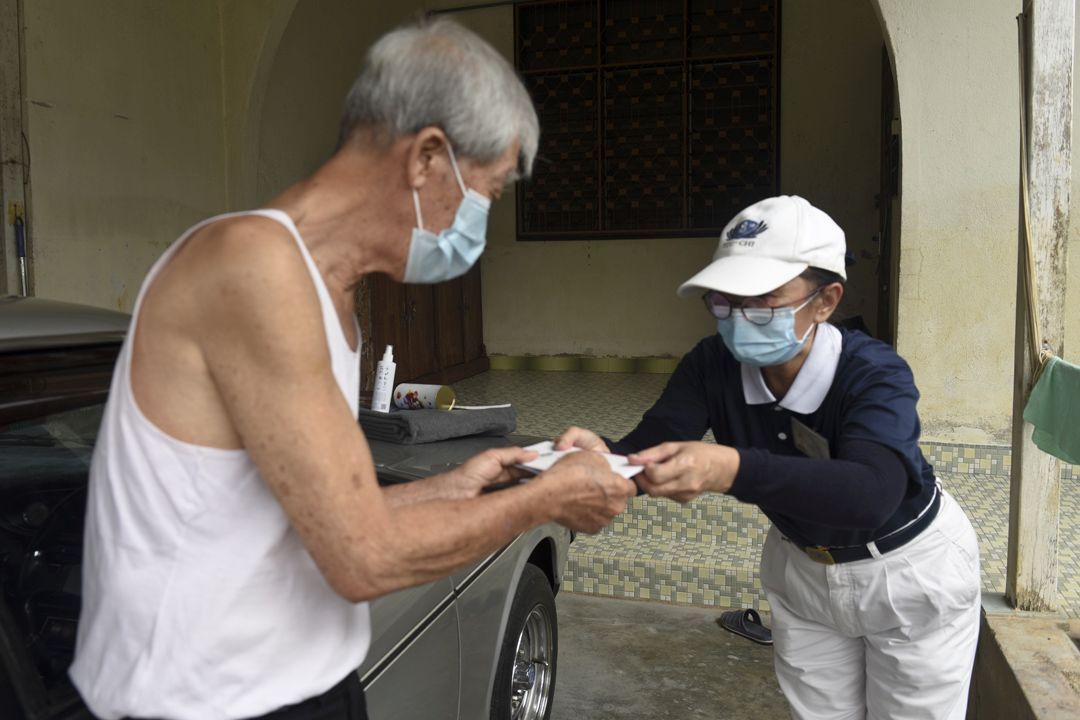 除了前来领取现值卡的灾民,志工韦金娣(慈宁)顾及年迈或独居老人行动不便出门,决定亲自把祝福金送上门,于是在陈家文(济欣)的陪同下,走访了十六户受影响的灾黎。