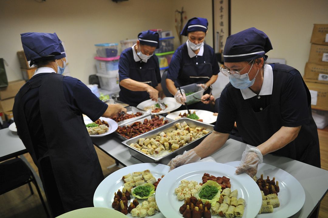 一道道美食上桌,色香味俱全,这些都是志工们于凌晨五时就开始准备的美味佳肴,只为了让来宾们能够大快朵颐;志工则殷勤地为来宾们添菜加水,鼓励大家多吃,来宾们也对美食多有赞美,尽情享用。