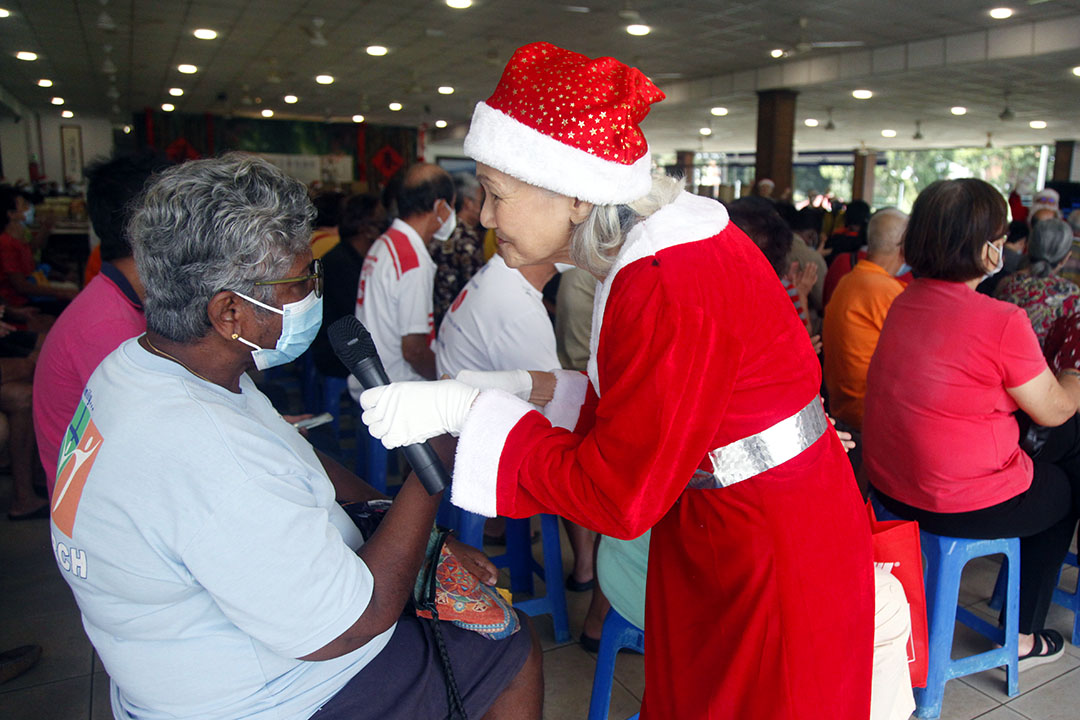 除了圣诞老公公派礼物,更有圣诞老婆婆唱起两首轻快且耳熟能详的圣诞歌曲,这是七十一岁的圣诞老婆婆唐艳蓉首次面对大众唱歌。她说,过去都是唱给自己听自我娱乐,因参与慈济长者学堂被发掘爱歌唱喜好,遂受邀到食物银行献唱,且连唱四回合,还愈唱愈欢喜!她说,看到他们开心,自己也很感动,希望可以让他们投入其中,融化心里筑起的高墙。