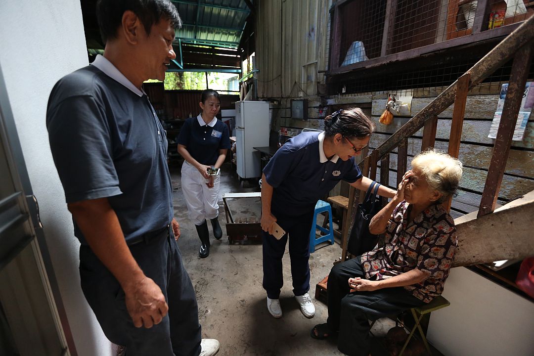 2017年8月11日,马六甲水灾期间,志工前往照顾户曾玉梅家,关心她的情况。【摄影:杨秀丽】