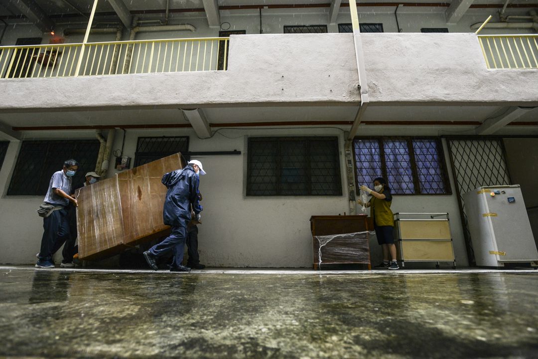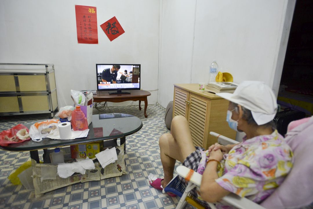 林婆婆坐在折叠式的休闲椅里,看着志工为了怕冰箱、储物柜等家具被雨水淋湿,特地用保鲜膜包裹起来,同时也将林婆婆的日常用品放进袋子或箱子里,准备一起用罗里载去新家。