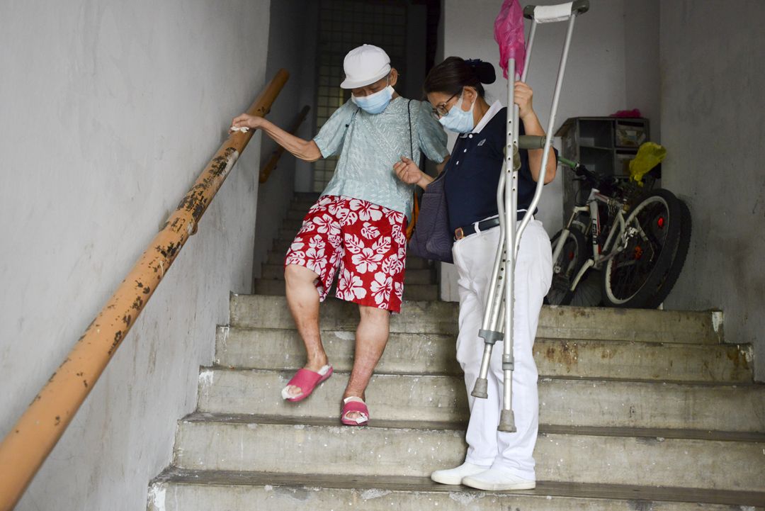 脚疾造成林婆婆上下楼梯有困难,即使出外,也要用助行器一拐一拐地走,最近这一两年,双脚无力,行动更不方便,往往一星期才下楼两三次买些日用品。幸好附近有素食店提供伙食送上门的服务,还能解决每日的餐食。
