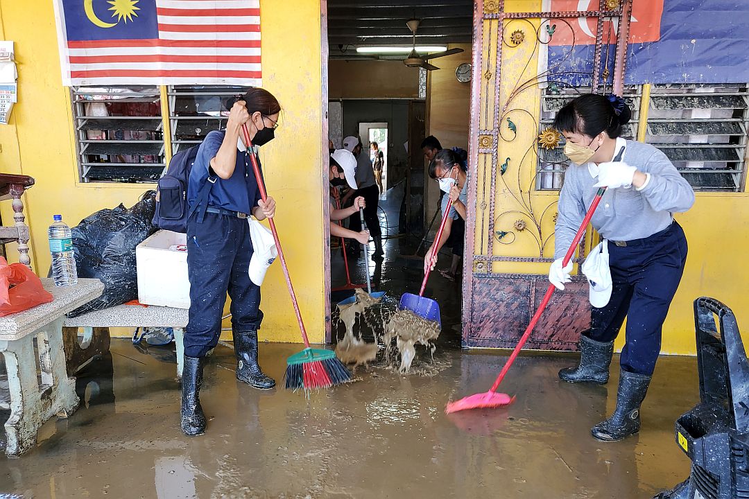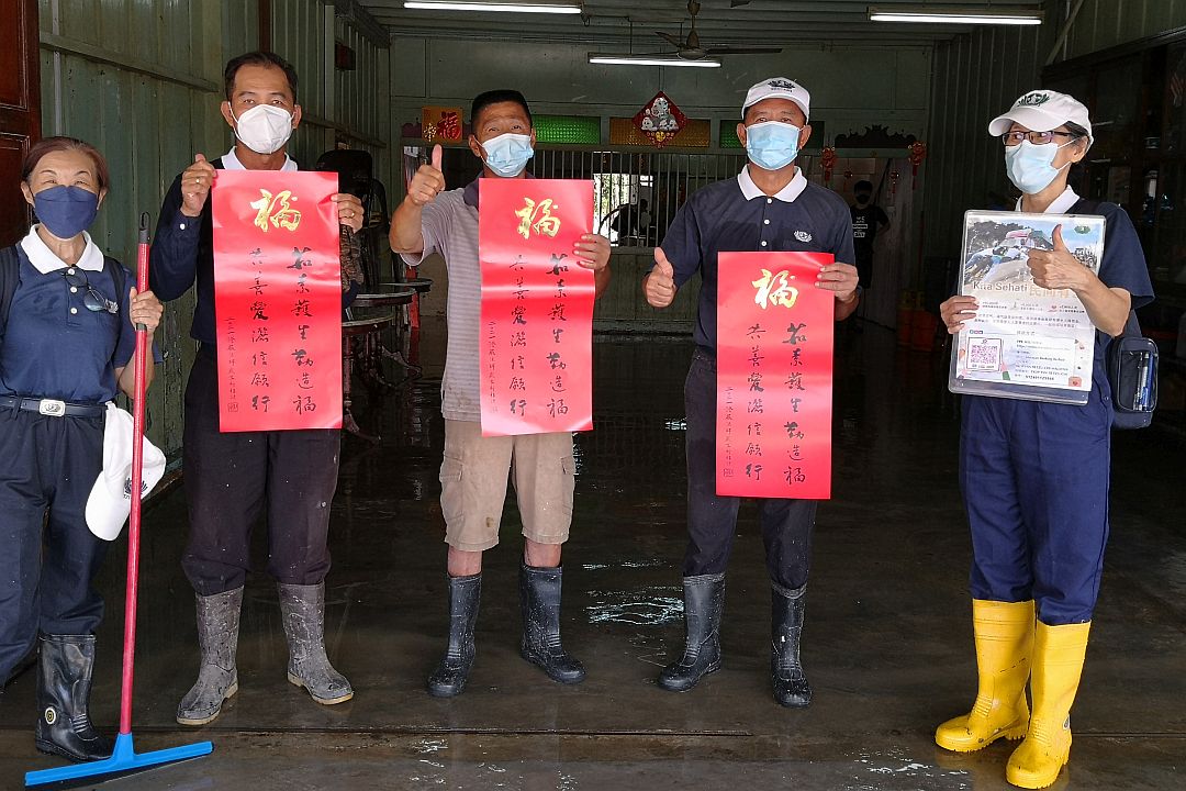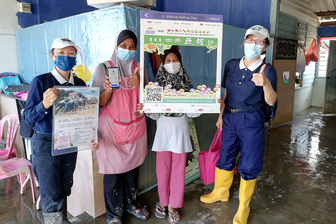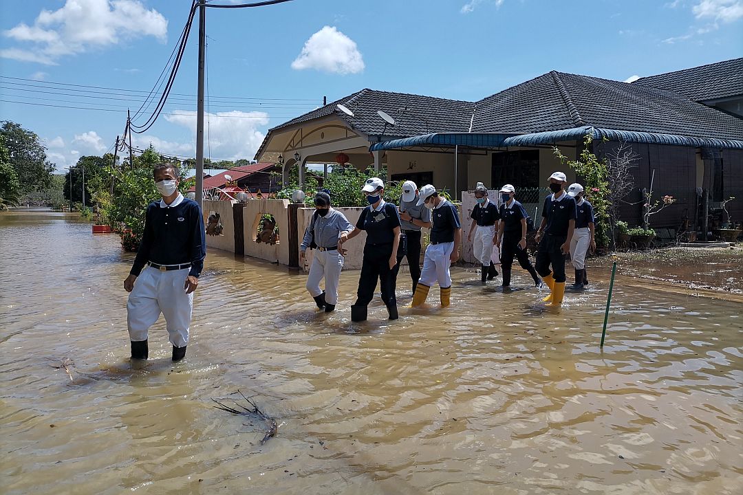 过后,志工团队分批前往各地勘灾,部分低洼地区水未退,志工涉水走入灾区关怀。同时也前往当地的疏散中心了解,该中心的民防部队(APM-Angkatan Pertahanan Awam)官员法芝烈(Mohd Fazlie)向志工说明该疏散中心在5日开始启用,目前有五十八位灾黎被安置在这里。