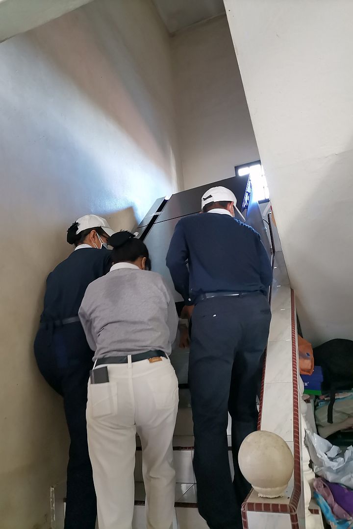 画面中的志工与神台上的菩萨相映成趣,却不失温馨,最重要是让屋主安心、让神像安身。另外一户家庭深怕新买的电冰箱会被水淹,志工先帮忙把电冰箱里的食物搬出来,然后一起合力把冰箱搬至楼梯口处。女众在协助搬运时,体现了女人当男人用。虽然费力,但一起竭尽力气务必将物品搬至安全处,让灾民们安心。