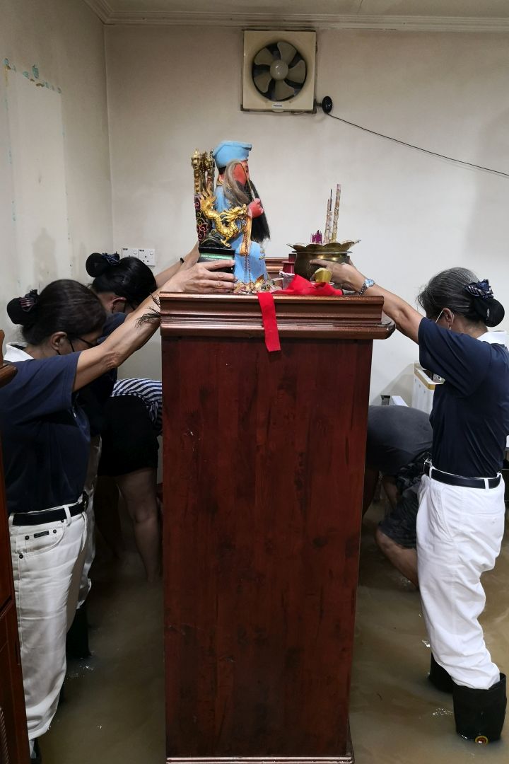 有一户家庭需要把神台垫高,当时水位蛮高,较难平衡及吃力。女众先把神台上的神像搬下来,男众帮忙把神台垫高;但之后发现垫得不够高,数位志工再次握着神台的神像,让神台可以再次垫高时,不会因为摇晃而掉入水里。