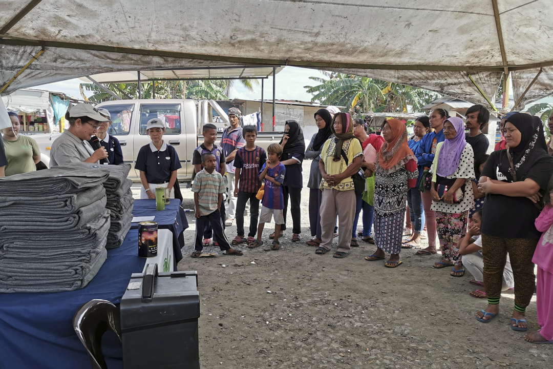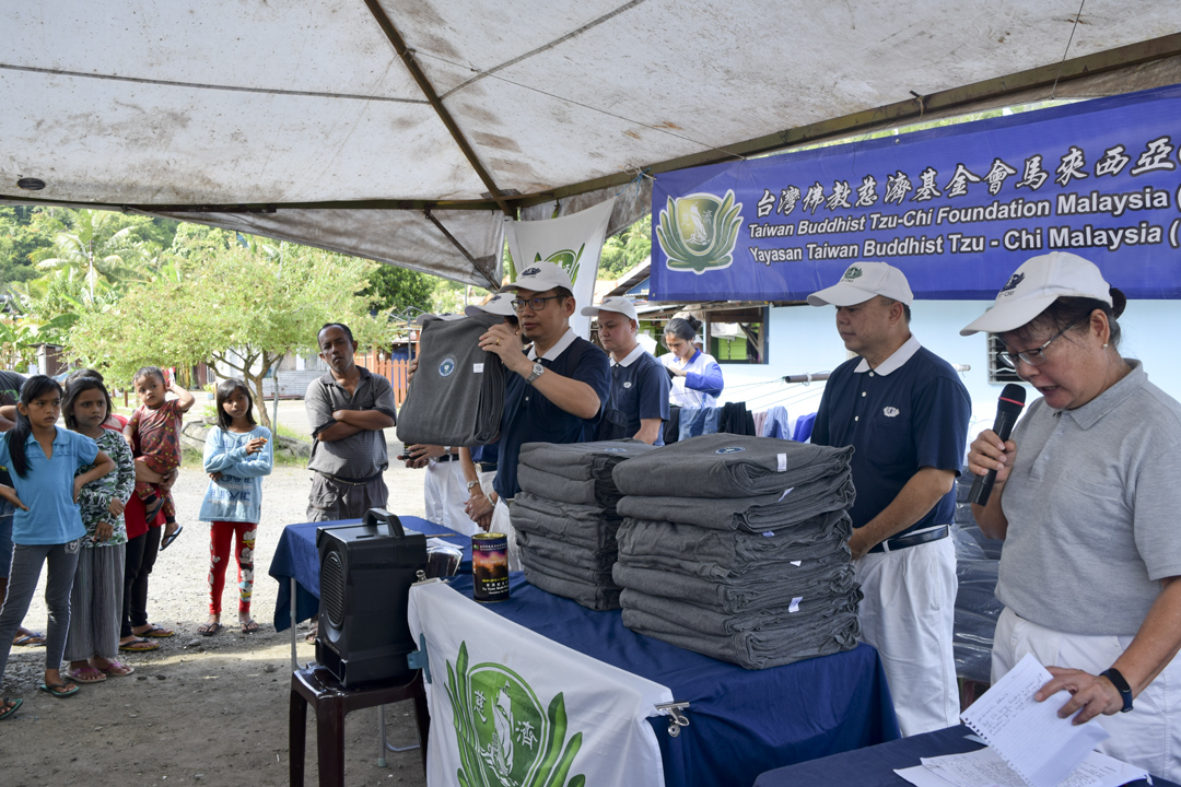 志工于午间三时抵达时,村长阿丁阿旺及灾黎已在现场等候,更协助志工布置,让发放仪式得以顺利进行。司仪恭读上人的慰问函及讲解赈灾毛毯的由来及制作,借以鼓励村民们力行环保。得知赈灾毛毯是宝特瓶制作而成,灾黎们皆感到新奇。接着司仪把握时间分享慈济的成立及介绍竹筒。得知竹筒岁月的故事后,灾黎们纷纷掏出零钱投入竹筒,学习做一个手心向下,帮助人的人。