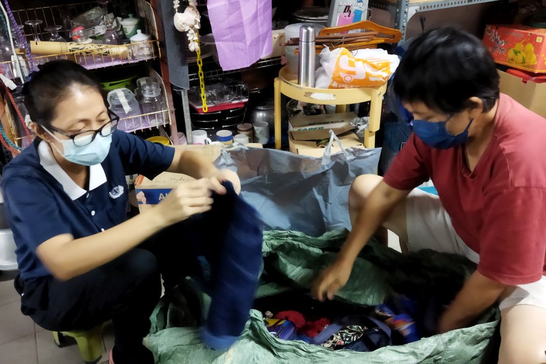 取得院方列出所需要的物资及日常用品清单后,7月8日早上,志工兵分两路;颜秀桃(慈棼)和李文明采买物资,包括白米、米粉、面粉、罐头淡奶、大葱、马铃薯、牙膏、干辣椒、咖喱粉,以及印度豆(kacang dhall);慈济芙蓉联络处负责人黄秋玉(慈楹)则和骆美花(明晴)、翁玉华前往芙蓉AST 环保站,翻找适合残疾人士的衣服、长短裤、袜子等。