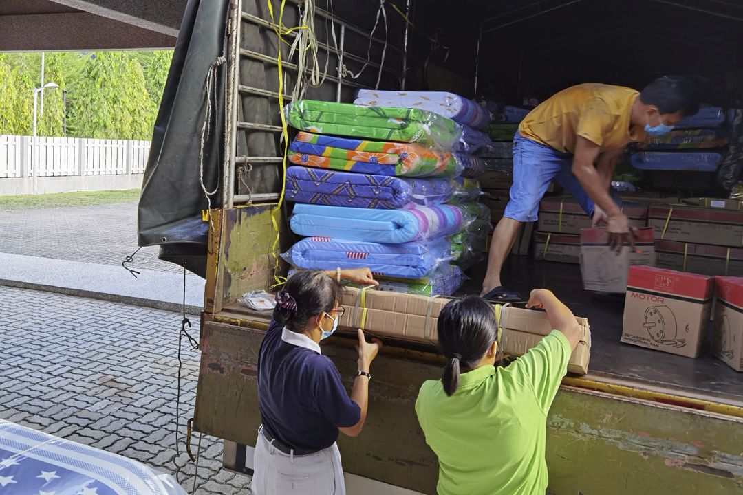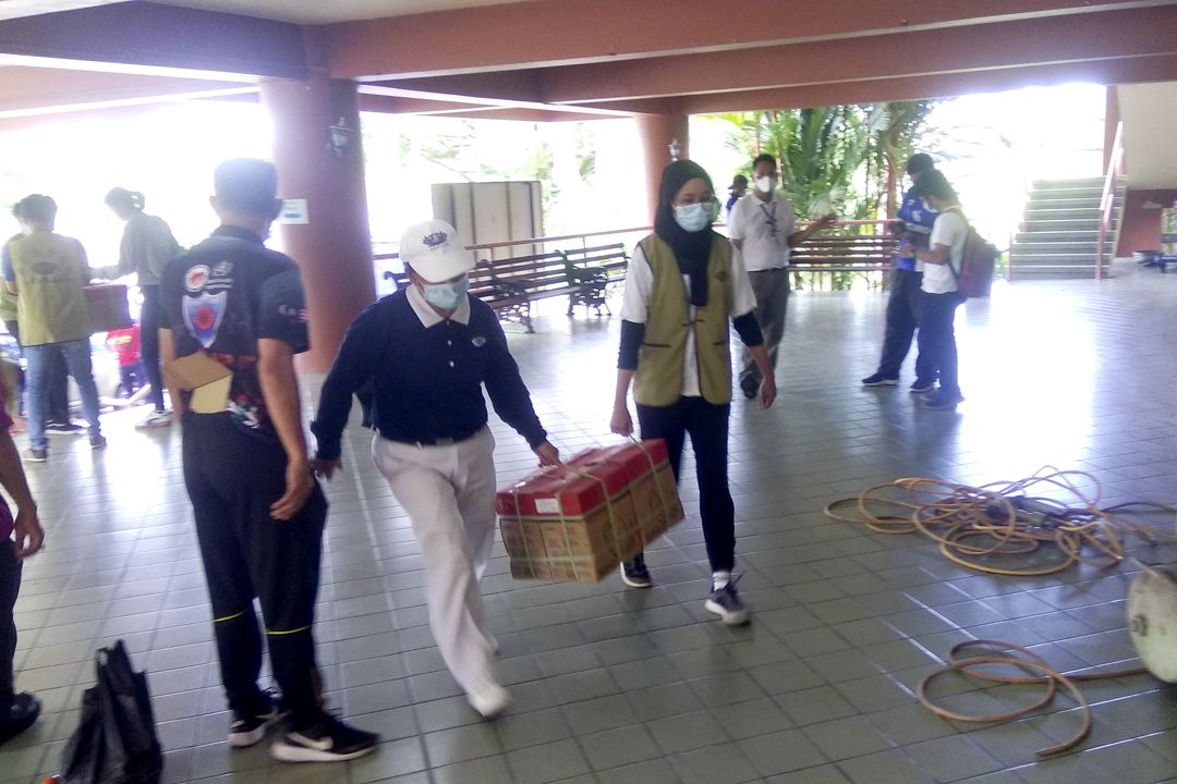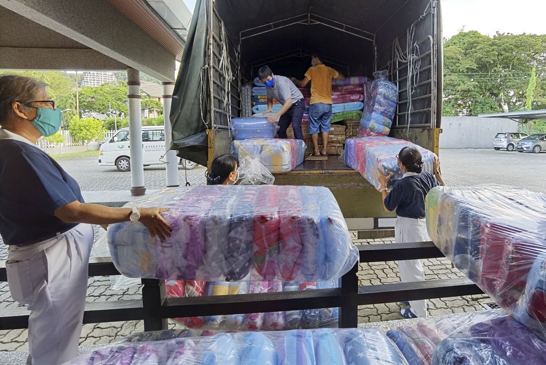 2020年10月29日,志工李师雄及影视同仁吴勇樻于凌晨一点半从亚庇驾车出发,大约三个小时到达孟奴卜码头(Menumbok Ferry Terminal),等待最早的一班渡轮,即清晨六点去纳闽。历时一个小时半的航程,终于把物资运送抵纳闽隔离中心。此次的支援,慈济提供了一百六十张床褥与一百六十个枕头,同时还借出四十一台大型站立式电风扇,以让确诊患者住得舒适及安心。