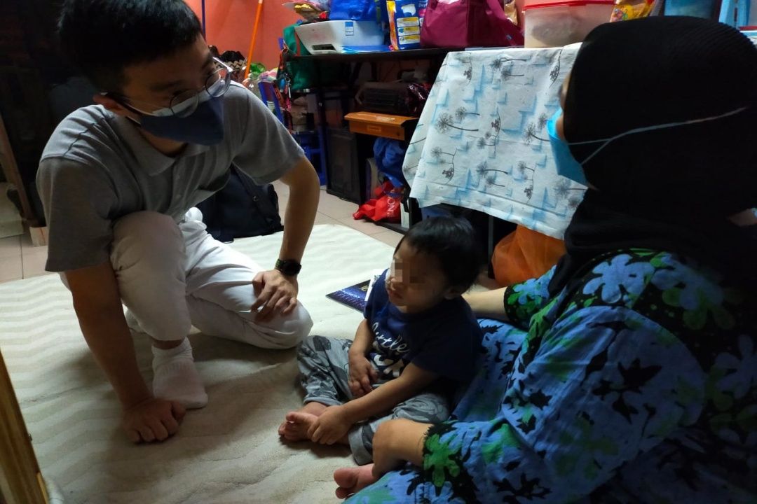 志工郭俊辉是物理治疗师,到访受惠家庭雅德女士(化名)的住处,得知孩子是特殊儿童,每月都需要进行物理治疗,但因疫情,已有数月没去复建中心。俊辉即现场示范,教导受惠者平日可以在家帮孩子进行物理治疗的动作。 “把他的脚掌往下压,再数二十下;这个动作是要让孩子感受到踏地,传达信息到脑部,让他记得踏地的感觉。”俊辉耐心的一一解说,其温柔的表情,感动在场的志工。