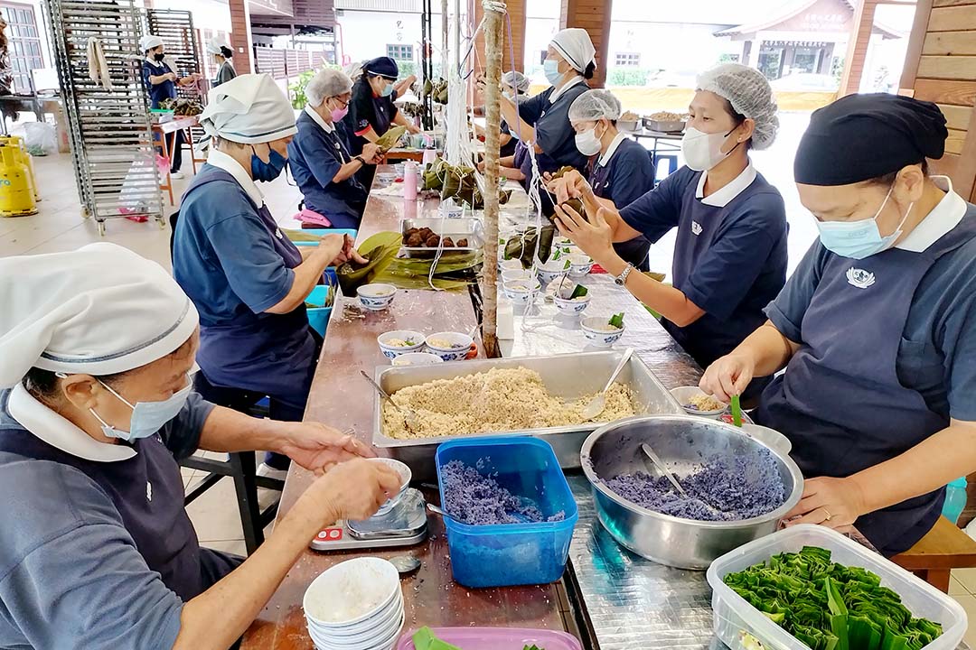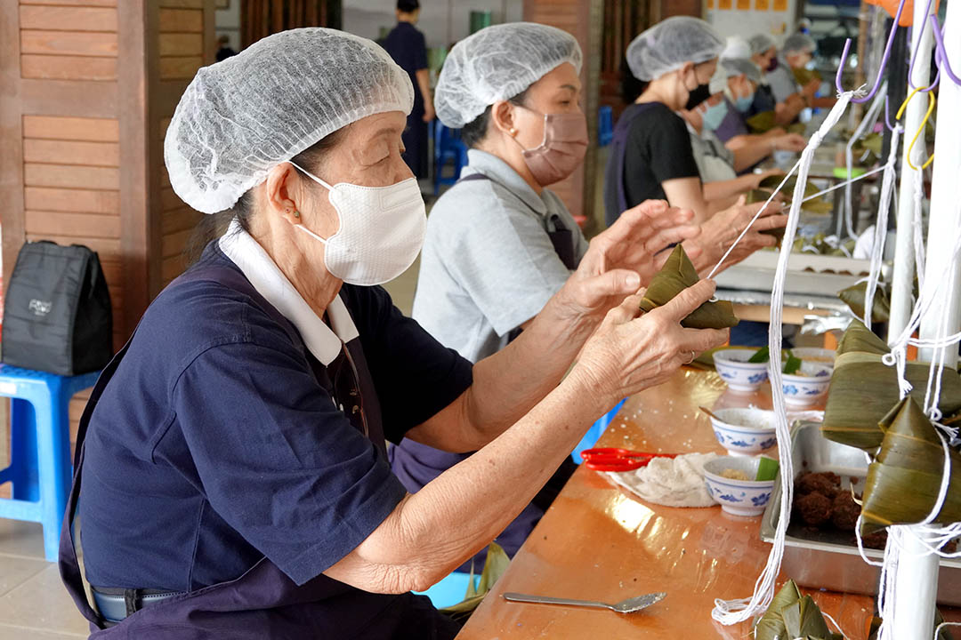 志工曾敬媚(虑莲)加入素粽制作团队已有三年。一早,她来回穿梭在各个角落,查看哪个岗位需要人手就去补位,如洗粽叶、秤馅料、捏馅料、清洗工具等。她谓:“以往秤好的馅料,她需来回走动传送到裹粽区。今年秤馅安排在裹粽的一旁,加快传送速度,节省脚力和时间。”