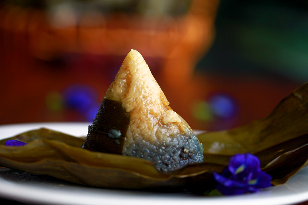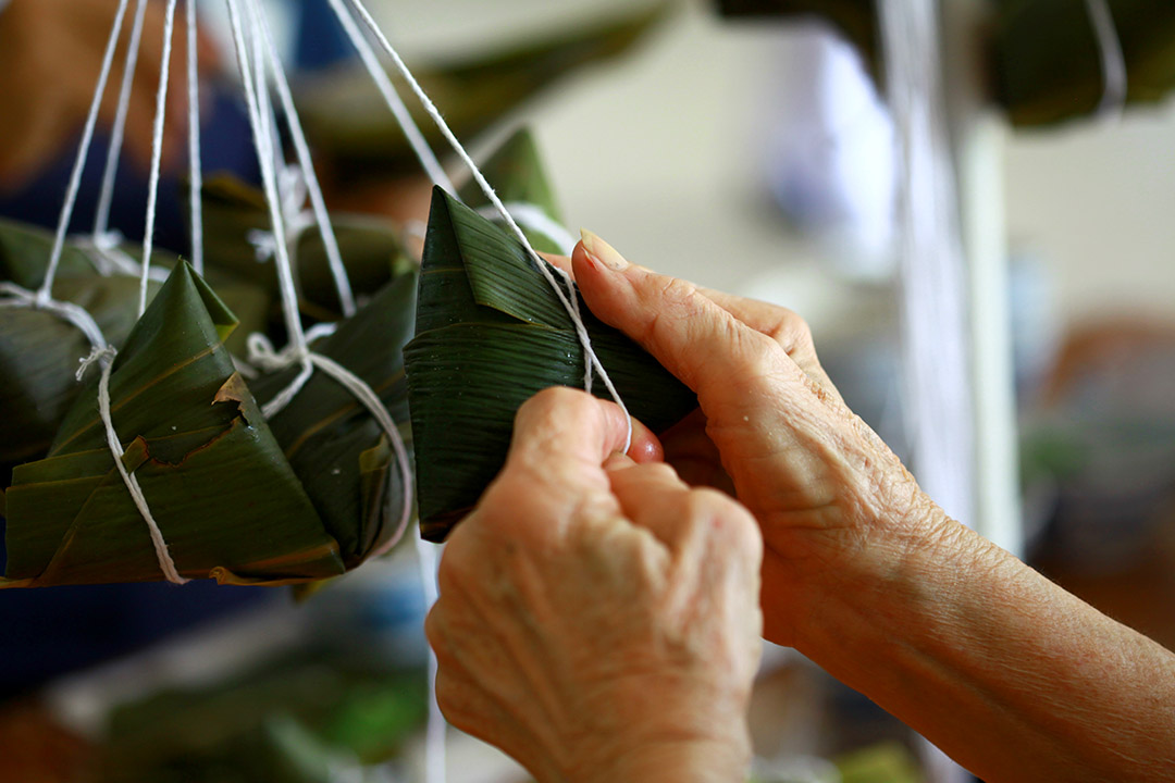 初次学习裹粽,黄秀莲虚心地向经验老道的志工讨教,经过屡次指导与反复学习,最终让她抓到窍门:“粽子的四个角拿捏得好,裹出来的粽子就会很漂亮。”她所绑的粽子一致通过“品质管理”的肯定,让她感到欣慰无比。
