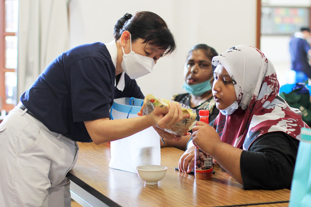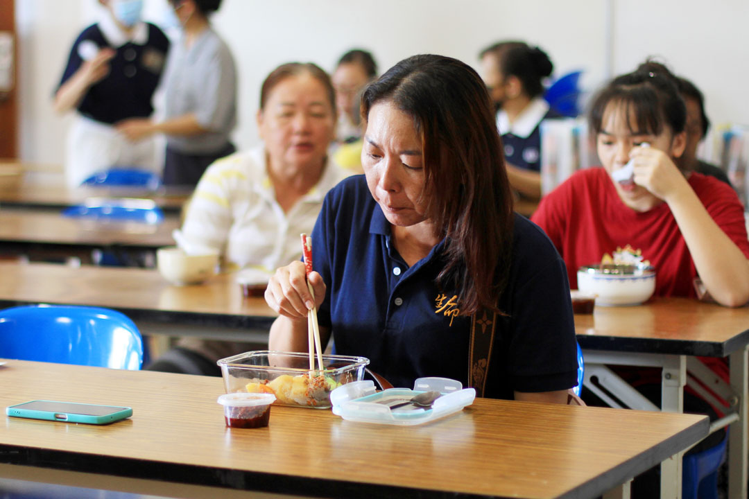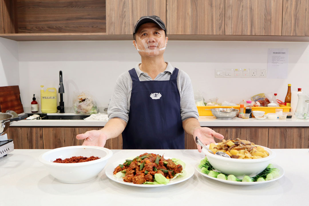 另一位照顾户江少玉,在学校的食堂工作,擅长烹煮也喜欢料理,今日与大家互动热络,过程中也不时提出疑问,如“为什么马铃薯和红萝卜要先炸?”、“为什么要用新鲜辣椒和干辣椒两种混合?”……