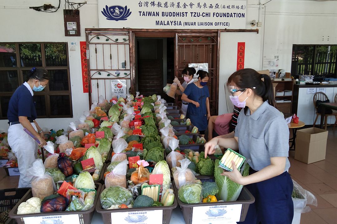 慈济志工在元宵节前,准备了缤纷蔬果篮作为元宵节的祝福礼,送给一百三十四户照顾户。里头约有十二种蔬菜,可以配搭烹煮二至三道菜肴。 【摄影:陈婵娇】
