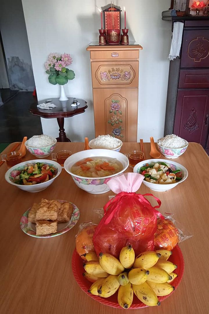 照顾户秦锦顺的妹妹拍了自己烹煮及祭拜的素佳肴照片,与志工分享。 【照片:秦锦顺提供】