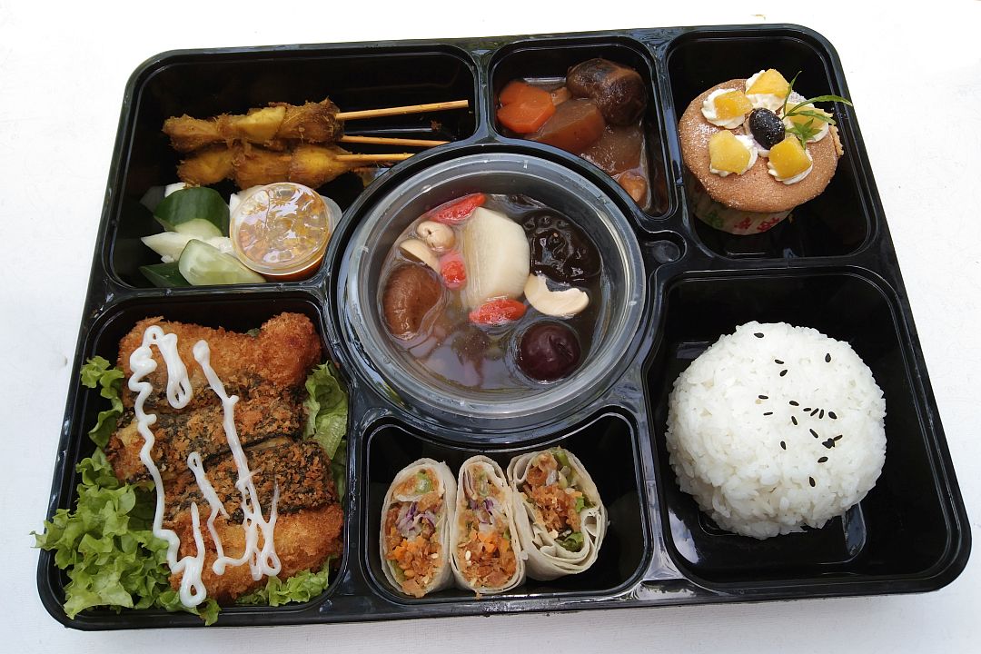 这份爱心便当有七样食物,包括白饭、汤、青菜、猴头菇素沙爹、紫菜杏鲍菇豆包及蔬菜卷等。