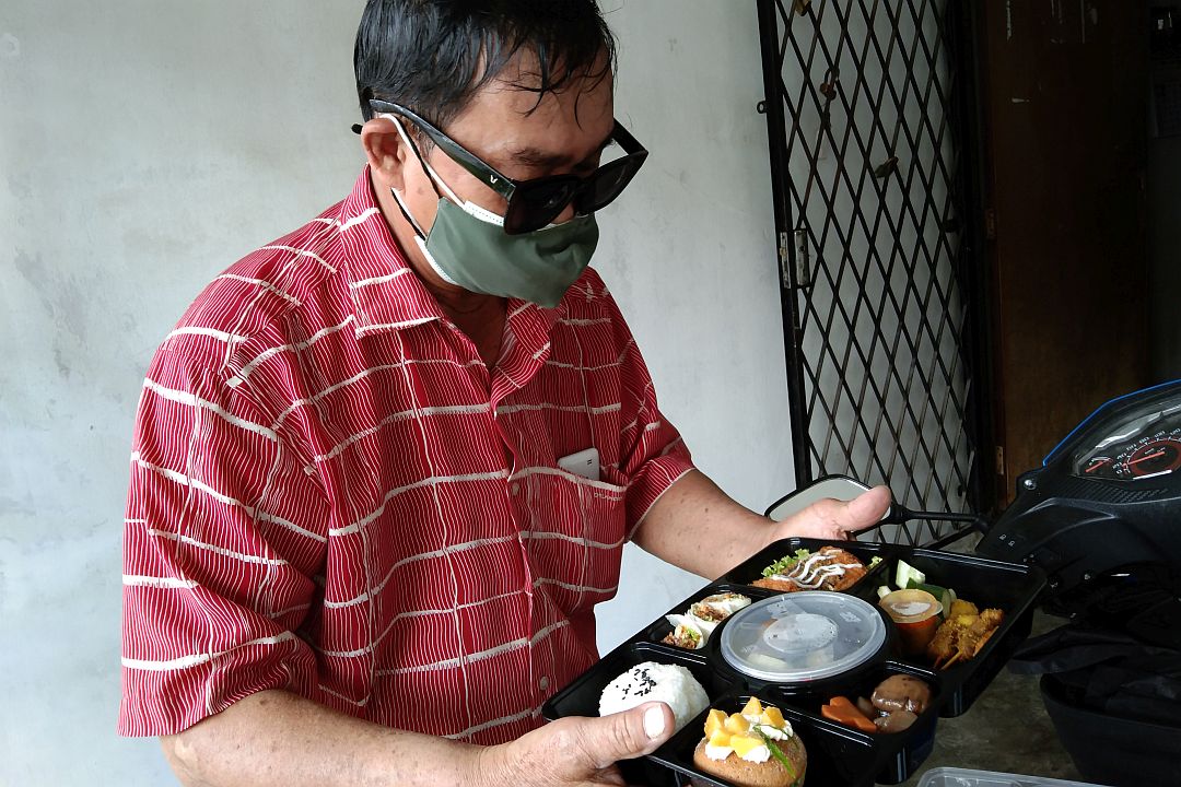 照顾户陈俊强收到志工送的爱心便当,打开看到色香味俱全,非常吸引人。 【摄影:陈婵娇】