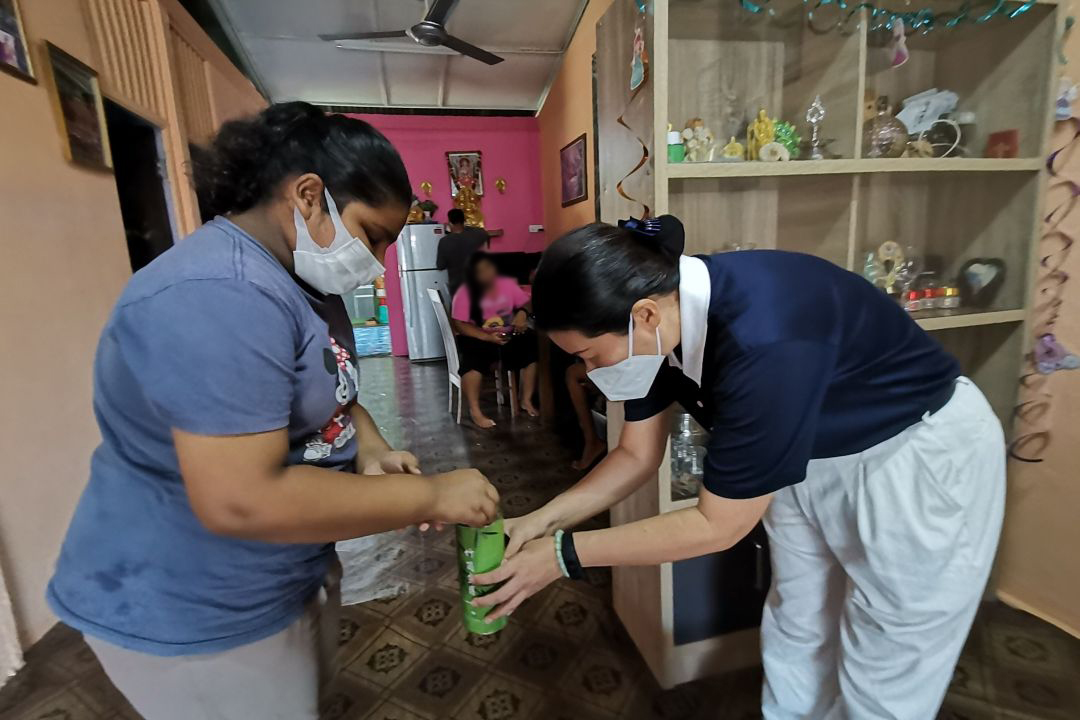 抵达时弗朗西斯正好外出做治疗,志工将屠妖节礼包和红包交给弗朗西斯的太太,并介绍礼包内的物品,尤其是里面两罐最珍贵的年饼。志工分享此年饼是由照顾户卡薇塔(Kaavitha)所制作,当初她的先生往生,顿失生活依靠,慈济提供孤儿寡母生活援助。 2017年屠妖节前,志工一步步教导卡薇塔从原料采买、计算成本到年饼制作,慈济马六甲分会再以市价购入,希望启发照顾户学习手艺赚钱贴补家庭开销,慢慢引导她自力营生,此手艺至今也成了她赚钱的技能。借此故事,志工鼓励弗朗西斯一家,重新找回生活的正轨。