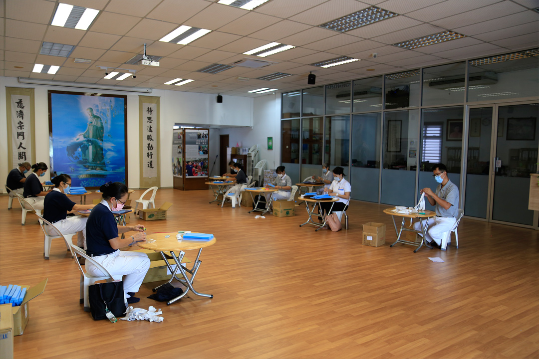 材料准备齐全后,芙蓉志工于3月25日开始,在会所为芙蓉中央医院麻醉部的医护人员制作三千五百个防护面罩。