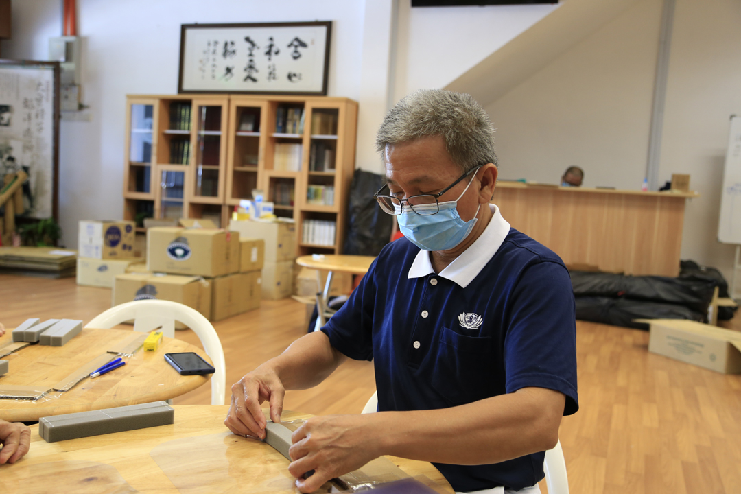 新进志工萧团燕协助找到芙蓉顺成手工用品店的东主,报效制作面罩的海绵和胶带,而且还亲自来付出。萧团燕认为,“在管制令期间,反正闲赋在家,利用早上的时间到会所制作面罩,生活更充实。有些志工还结缘午餐,看到志工们的团队精神,令人感动。”