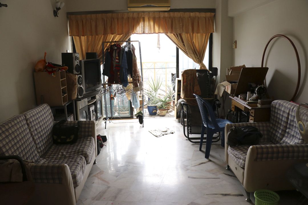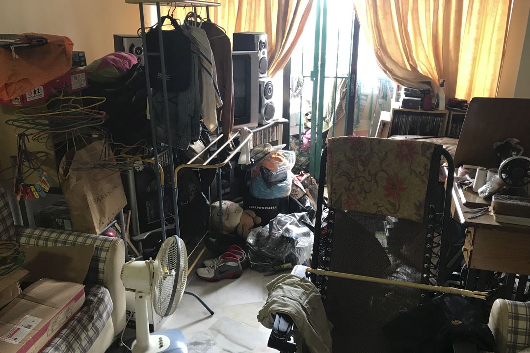 12月初,丽晶与幼珍到秀容家探访。刚抵达门口,两人都吓一跳,因门外堆积的杂物几乎堵住了大门。而进到屋里,但见客厅凌乱、桌上、角落堆满空的宝特瓶及杂物,还有衣服也随处可见,加上露台除了有十多盆盆栽外,更有不少瓶瓶罐罐及坏了的电器、纸箱等,由于杂物多,通往露台的门被堵住,长期都不打开,造成屋里空气有些闷热,光线也显得阴暗。