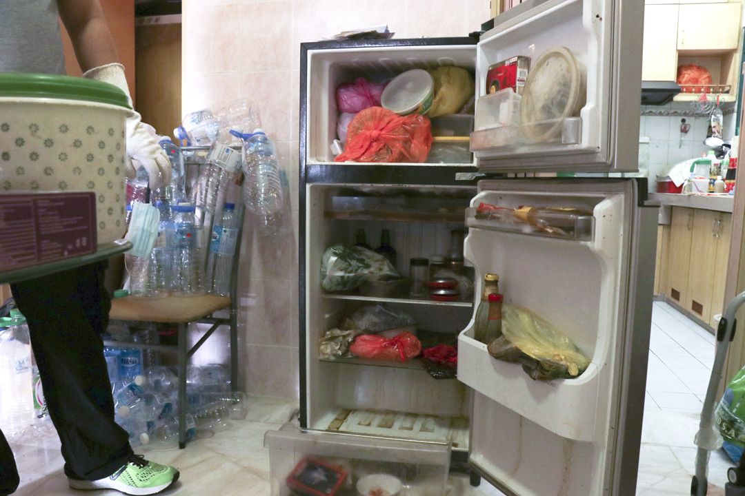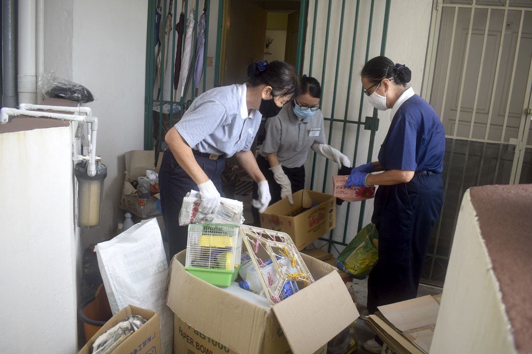 住在同栋公寓的志工谭丽晶(慈瓅)承担起协调,熟练地分配工作。随行志工来到门口一看,都不由吓一跳。原来,门外堆满一圈圈的铁丝网、坏了的饮水机、一箱箱装满纸张、报纸、杂物的纸盒,连屋里玄关也放满凌乱杂物,若这些资源、杂物不先清除,则要从屋里搬东西出来也成了大问题。