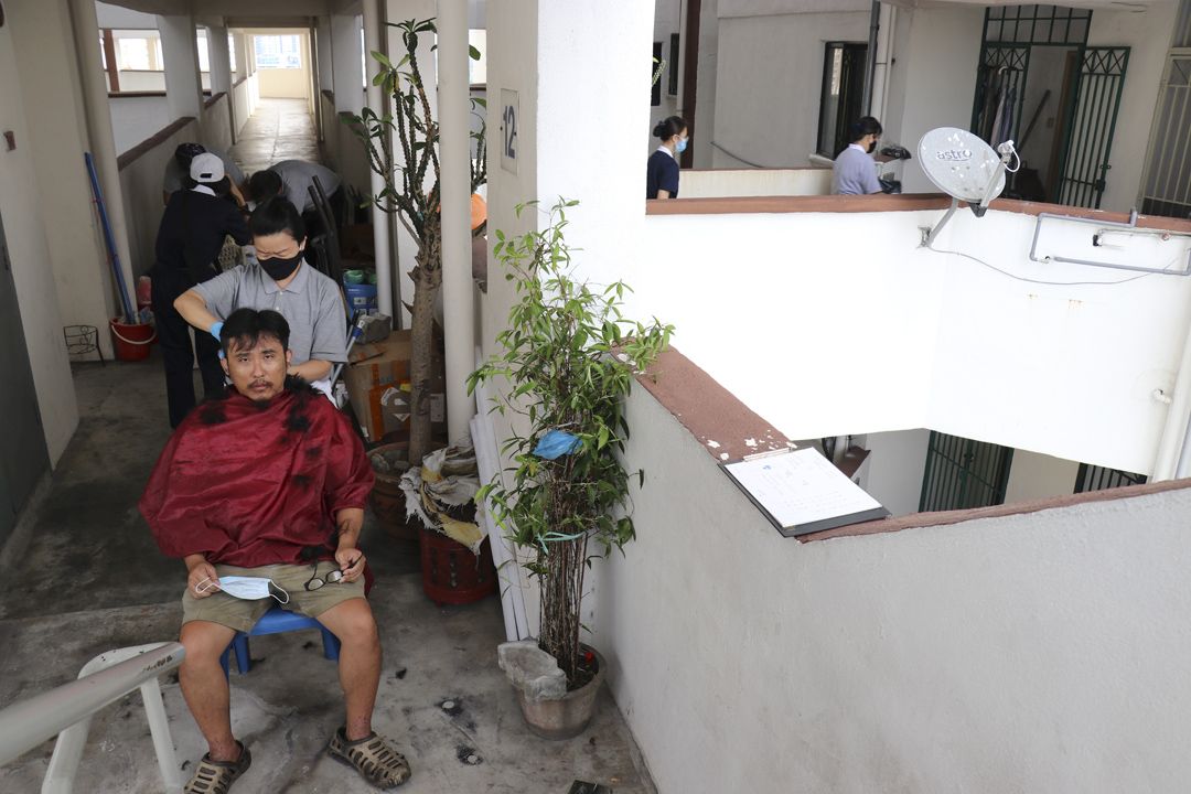 幼珍趁机带义民到走道角落,原来那是临时剪发区。幼珍介绍剪发的志工是美发师,特地来帮义民母子剪发。义民温顺地坐在椅子上,任由志工帮他修剪头发。不到半个小时,理好发、剃好须的义民显得精神奕奕。