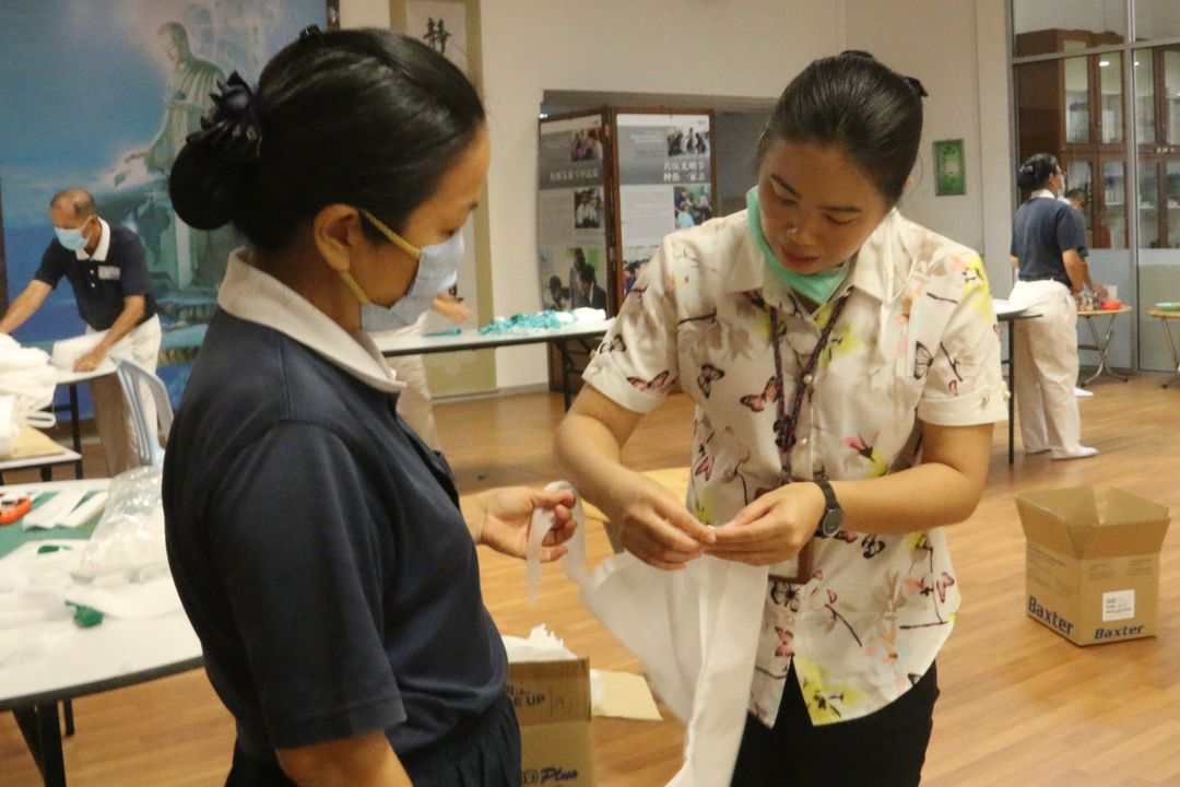 新冠病毒疫情开始时,任职芙蓉中央医院复健科治疗部(Occupational Therapy)十三年的朱爱玲,开始教导护士们善用部门内的缝衣机缝制头罩、鞋套及防护衣。她说,“没想到疫情迅速蔓延,护士们应接不暇,只好再次请慈济志工协助缝制一千两百件头罩和五百件防护衣。缝制好的医疗防护品,将会交到医院的感染控制部(Unit Infection Control)。医院各部门可向该部门申请所需要的数量。”朱爱玲还亲自指导志工如何缝制简化版的防护衣物。