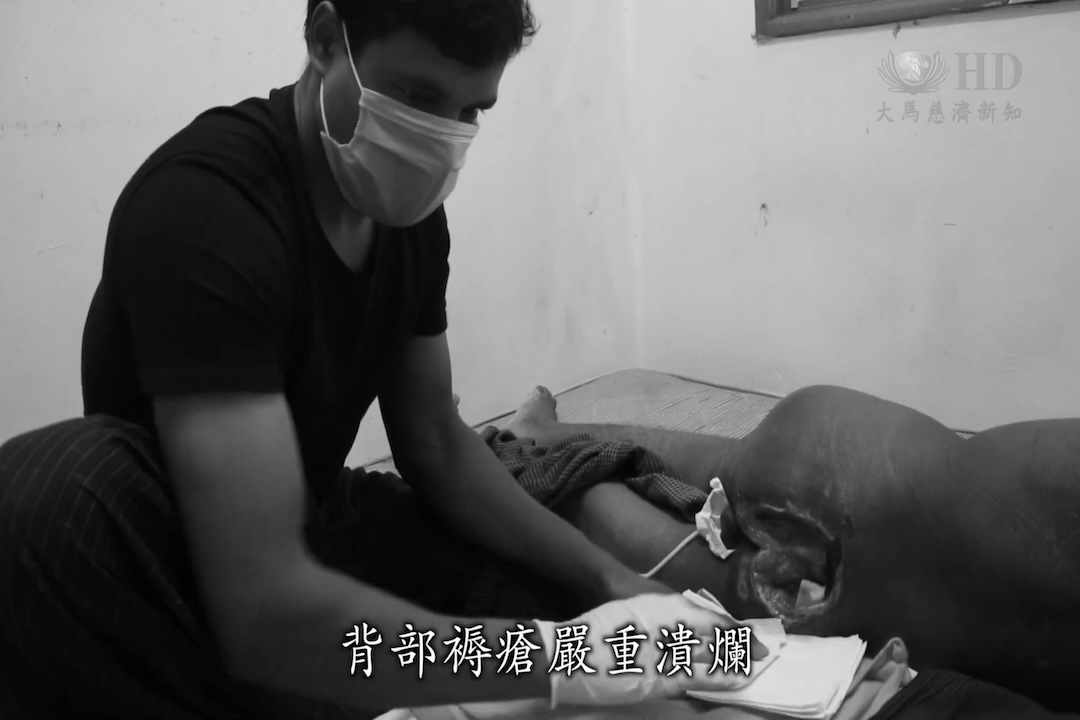 2019年,他从摩托车后座跌落,下半身瘫痪。长期卧床,他没有得到妥善照顾,臀部出现严重褥疮,伤口溃烂感染。【摄影:大爱新闻截图】