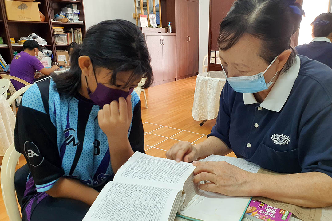 “'无家可归'是什么意思?”志工老师刘嫒莲(慈嫒)请她从书柜找来《汉语辞典》,再从辨认部首、计算笔划开始,学习用工具书找答案,找到读音、再看辞语解释及抄写。陪伴一个多小时下来,不少词汇得到解答。