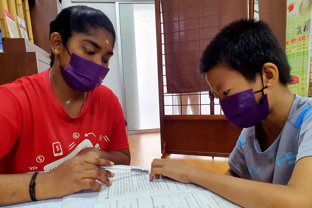 此外,还有就读中学预备班的哥哥王伟强,在印裔大姐姐娃希妮(Varshini A/P Murthy)指导下,阅读马来文及回答问题。虽然一字一字地念,发音还相当准确,在旁的志工说,王伟鸿还有心向学,遇见不懂的字,还会请问“字典老师” 。