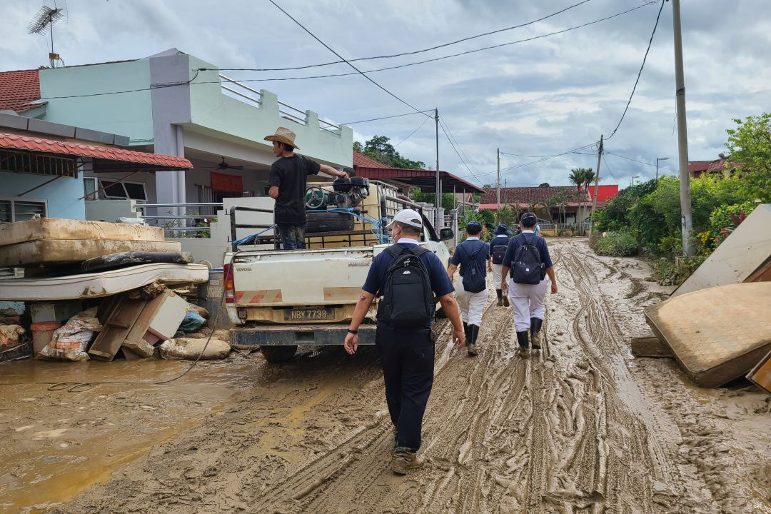 12月20日上午八时,二十四位志工在慈济会所集合,大家准备好防疫措施、戴好口罩,携带手套、净手液、水鞋、帽子以及清理灾区的用具,聆听汇报和分组后,大家分乘两辆四轮驱动车、一辆慈济包厢车及一辆志工的包厢车,浩浩荡荡出发前往知知港河沙坝水灾重灾区。由于主要通道遭受土崩尚未清理,大家只好从瓜拉庇朥路绕道而行,抵达时已是上午十一时一刻了。