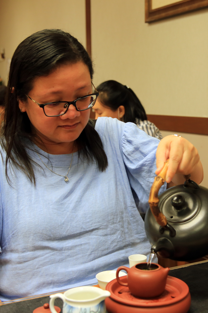 赖老师示范及指导,学员们一起动手学泡茶。赖老师说:“品茗重在色香味,色香味佳靠的是茶好、壶好、水质妙;场所慎选功夫高,茶量水温时间到,泡茶功夫在诀窍。”