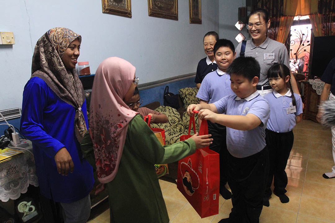 志工和亲子班成员陆续出发到各“感恩户”家,其中一组在鲁容(Duyong)社区,西蒂(Siti Aishah Binti Arshad)一家开心迎接志工与亲子们的到来。