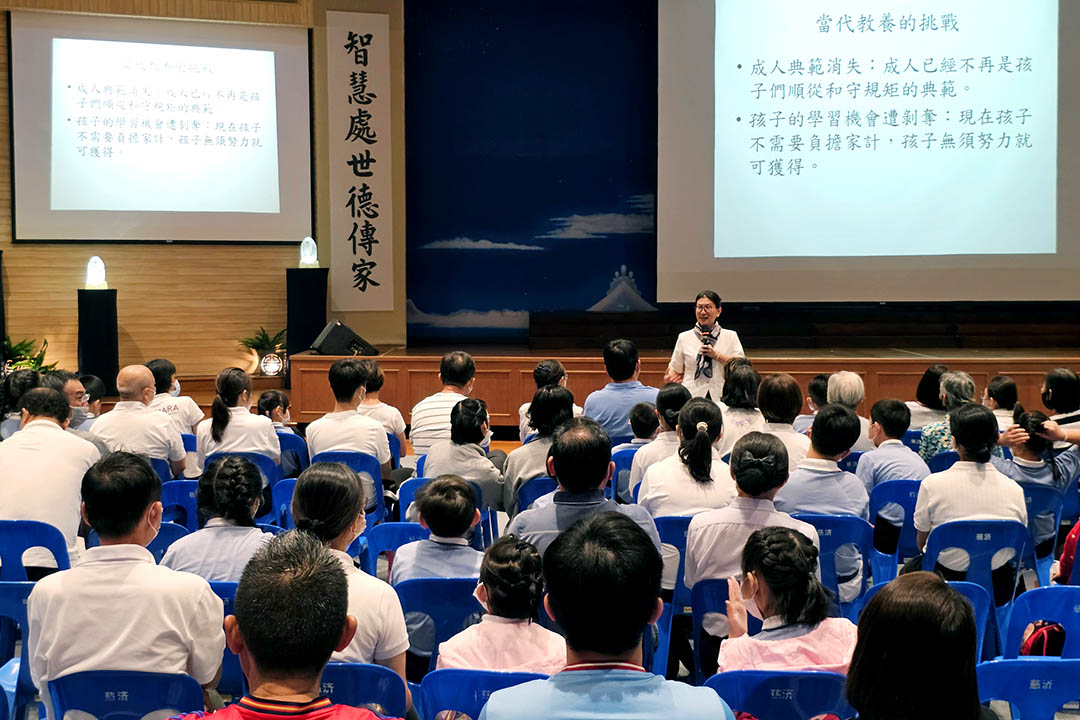 今日并邀请慈济科技大学人文室主任谢丽华博士与现场亲子分享“用智慧照见孩子的需要——谈品格教育”,针对亲子关系深入探讨,了解真正的品格教育是在训练孩子的自律能力及自我控制,培养孩子的自信心,勿用言语扼杀孩子的能力。尤其青春期孩子在意别人眼光,感觉全世界都在看他,感觉做某件事很幼稚,请家长放手让孩子学习辨识是自己意识感受,还是事实。父母亲只要认清角色与责任,角色不同,看待事情就会变得不一样。