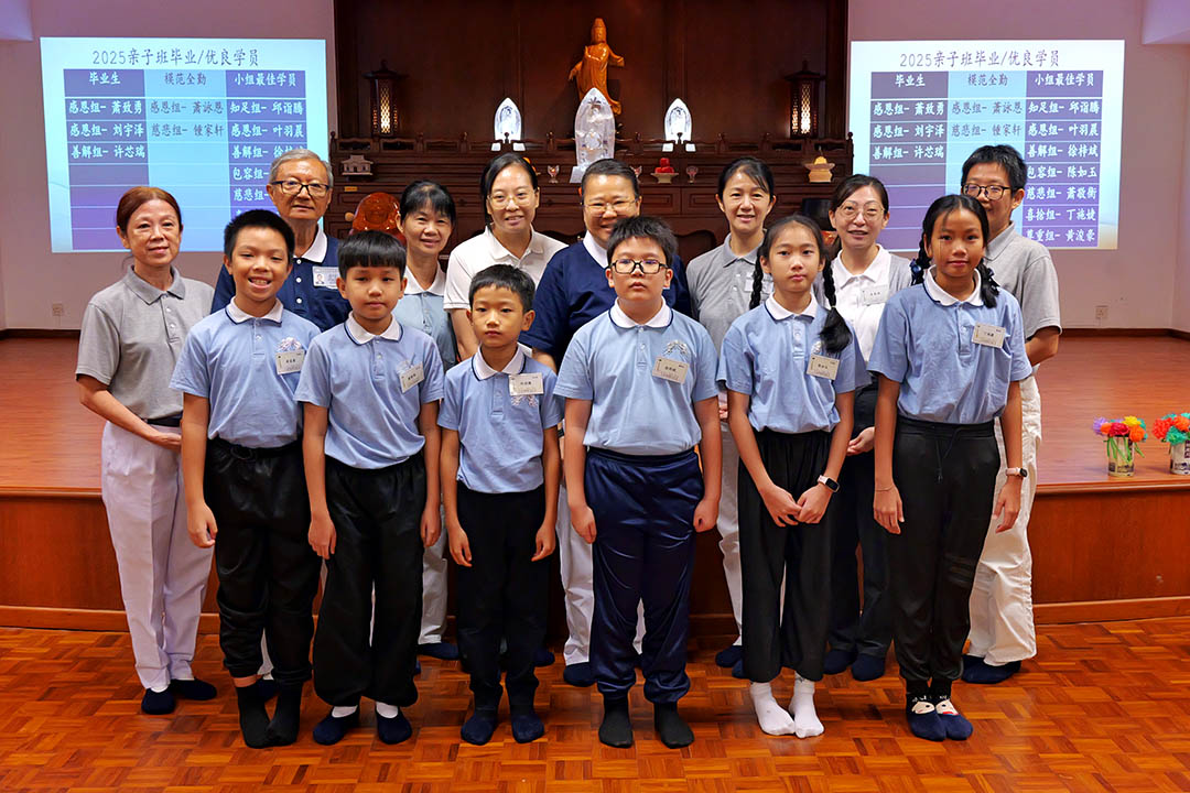 就读三年级的萧咏恩也分享,她在亲子班学到许多生活与品德的道理:“不要杀生,要吃素;要多说好话,不要说坏话;要懂得分工合作。”她感恩师姑师伯(志工)一路的教导,让她在学习中成长,也在陪伴中感受到爱。