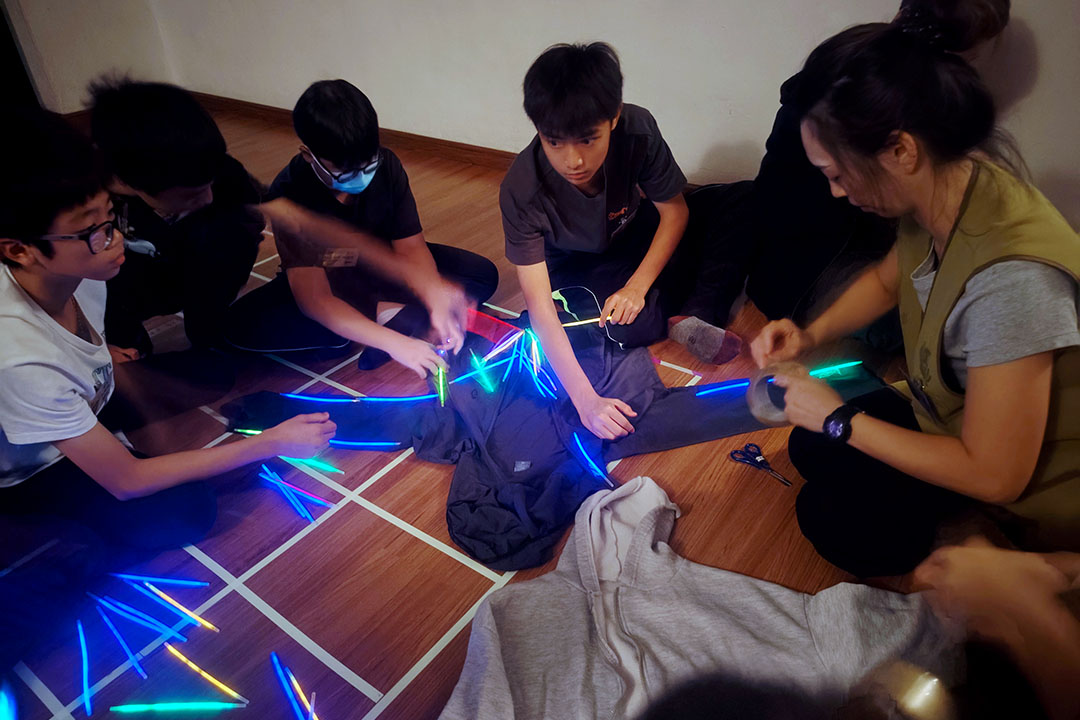 体验在黑暗中玩游戏,营员们合作把莹光线贴在衣服上作准备。【摄影:张雁玲】