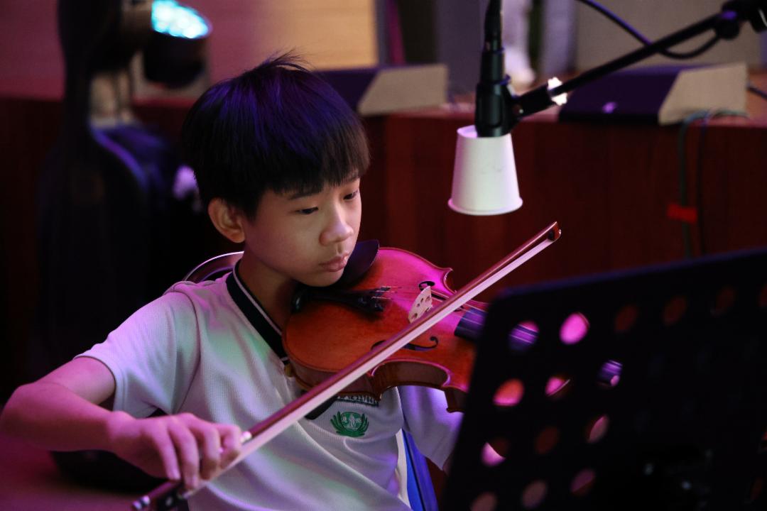 九年级知足班的章亦信是乐队中的小提琴手之一。他四岁开始学习小提琴,这十一年中,他曾经参加过比赛,也参与管弦乐队,到处表演,累积了很丰富的表演经验。
