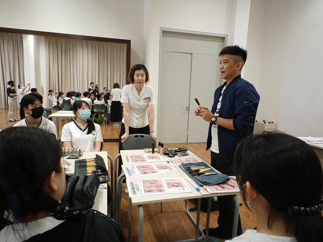 有多年彩妆经验的国安老师不但是专业的彩妆师,还有自己的化妆课室。他多次以他的专业在慈济活动付出如,“浩瀚父母恩”舞台剧彩妆师,“道”嘉宾化妆师等等。国安老师除了教导学生化妆技巧、化妆工具的卫生与保养,也跟学生分享如何与表演者沟通,让对方更信任自己,把脸交给自己,也要关心对方是否有敏感,衣服颜色的彩妆颜色的搭配、角色性格等等。另外,人手安排、流程等等专业知识,也不吝啬跟学生分享。