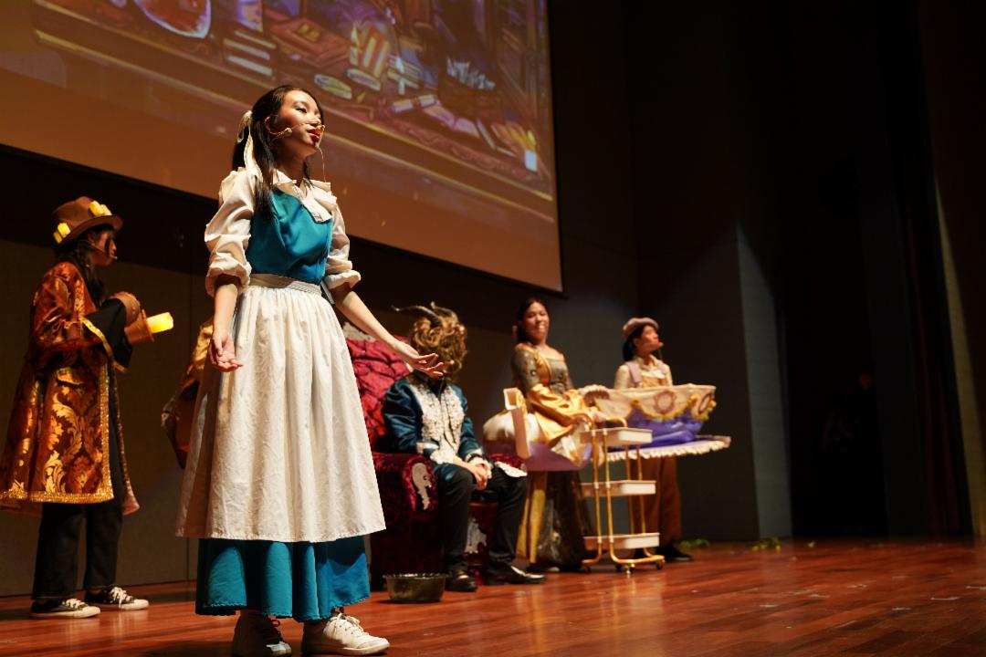 礼堂前又大又醒目的“美女与野兽”的海报,是观众入场前的打卡区。舞台表演时,打在萤幕上的背景和礼堂前的醒目海报,都是十年级勇气班的林佳昀花了很长时间作画的。表演开始,佳昀默默的在音控室里根据剧情播放不一样的背景图。