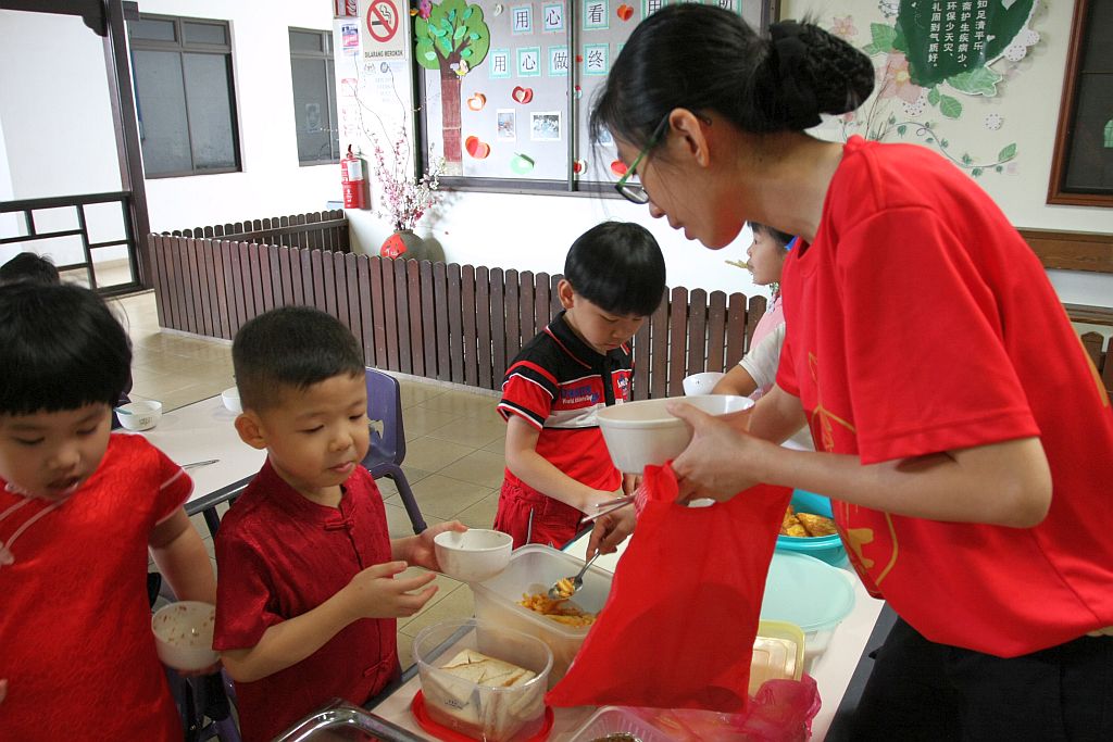 五岁的陈杰宇一早便帮忙搬抬椅子,准备待会儿与全校老师、朋友和家长一起庆祝新年团圆饭。家里只有五位成员,新年鲜少有人来家里拜年,因此可以与大伙儿一同庆祝新年,他格外兴奋:“今天要庆祝恭禧发财,所以我穿新衣来。现在搬椅子给大家坐,我没有吃过团圆饭,所以很开心!”