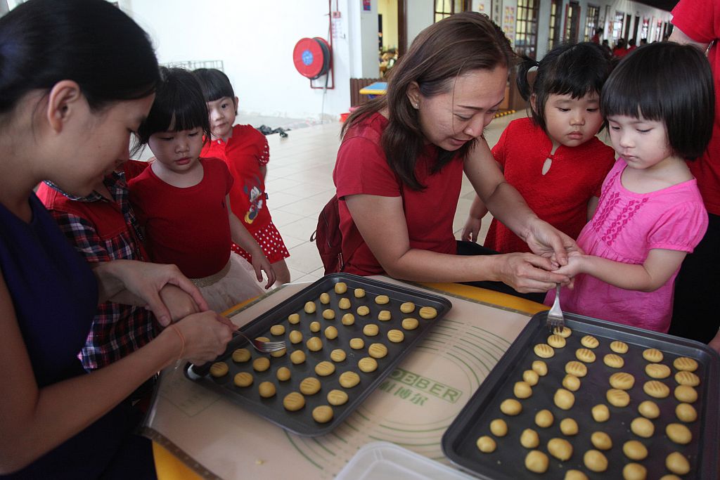 下午时分也让小朋友体验制作应景年饼和鸡蛋糕的乐趣,让孩子们明白家里各式各样的糕点,是大人们用心制作来款待上门拜年的宾客。只见一个个圆圆的奶油面团,用叉子在边缘一按,即变成有花纹的造型,等待入烤箱;而鸡蛋糕则从传统的炭火烘烤,变成现代版的电子炉烘烤,让人轻松就可上手!