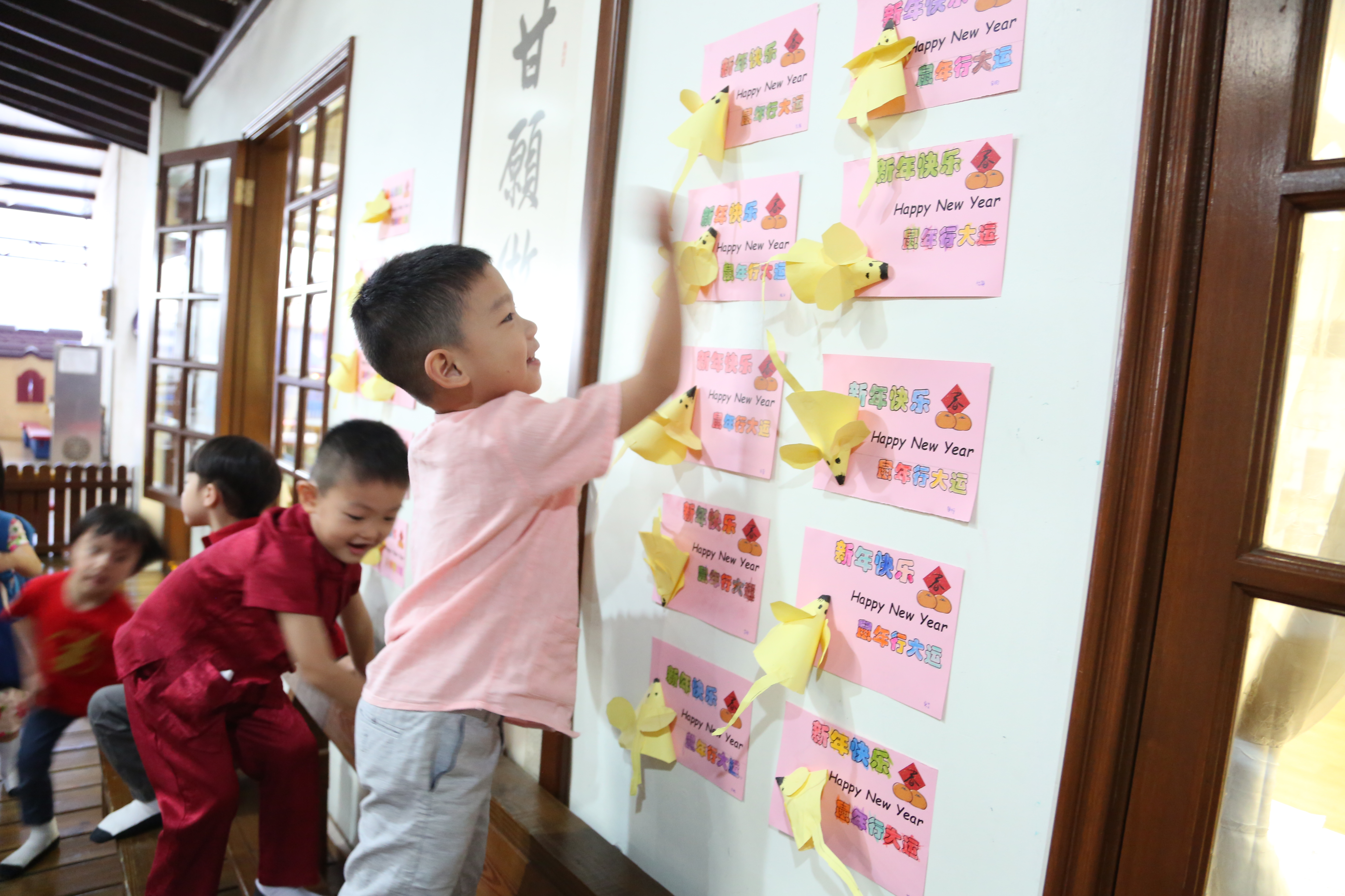 马六甲大爱幼儿园大红灯笼高高挂,随处可见春联、剪纸,以及小朋友们亲手制作的手工老鼠装饰; 老师和孩子们穿得喜气洋洋,家长手上拿着美味可口糕点,浓浓的年味热闹登场,迎接2020金鼠年来到。