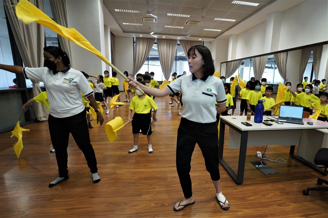 来自黄队的小学部辅导老师罗国祥,负责学生步操队。一共四十五位来自三到六年级的学生参与步操队。当中有部分五、六年级的同学,去年有参加过步操队,其他大部分学生都是第一次参与。参差不齐的身高、年纪和学生的体力,都成了考量;比如老师需要思考如何布局、排列队形,将适合的人选放在适合的位置,因此训练技巧是有难度的。
