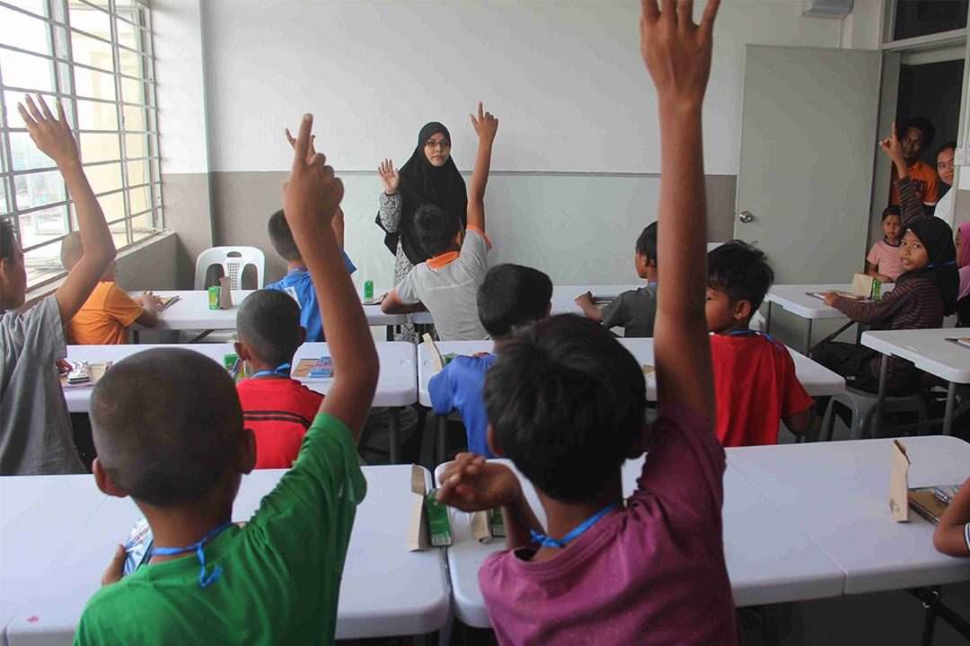 从楼梯口到三楼的课室,一路上欢笑声不断。来到课室门口,第一堂课就是教导小朋友把鞋子放入鞋袋里,以保持课室的清洁,展现人文之美。小朋友依照昨天已排好的位置,安静地坐下,没有争先恐后。奴鲁玛丽亚娜老师(Nurul Mariana Binti Siminggu)请大家自我介绍;由于班上小朋友年龄较小,识字力弱,有些还不能辨认自己的名字,老师提醒同学看着挂在胸前的名牌,跟着老师读。奴鲁玛丽亚娜老师发现几位同学掌握不了,便坐在地上和小朋友一起学习。