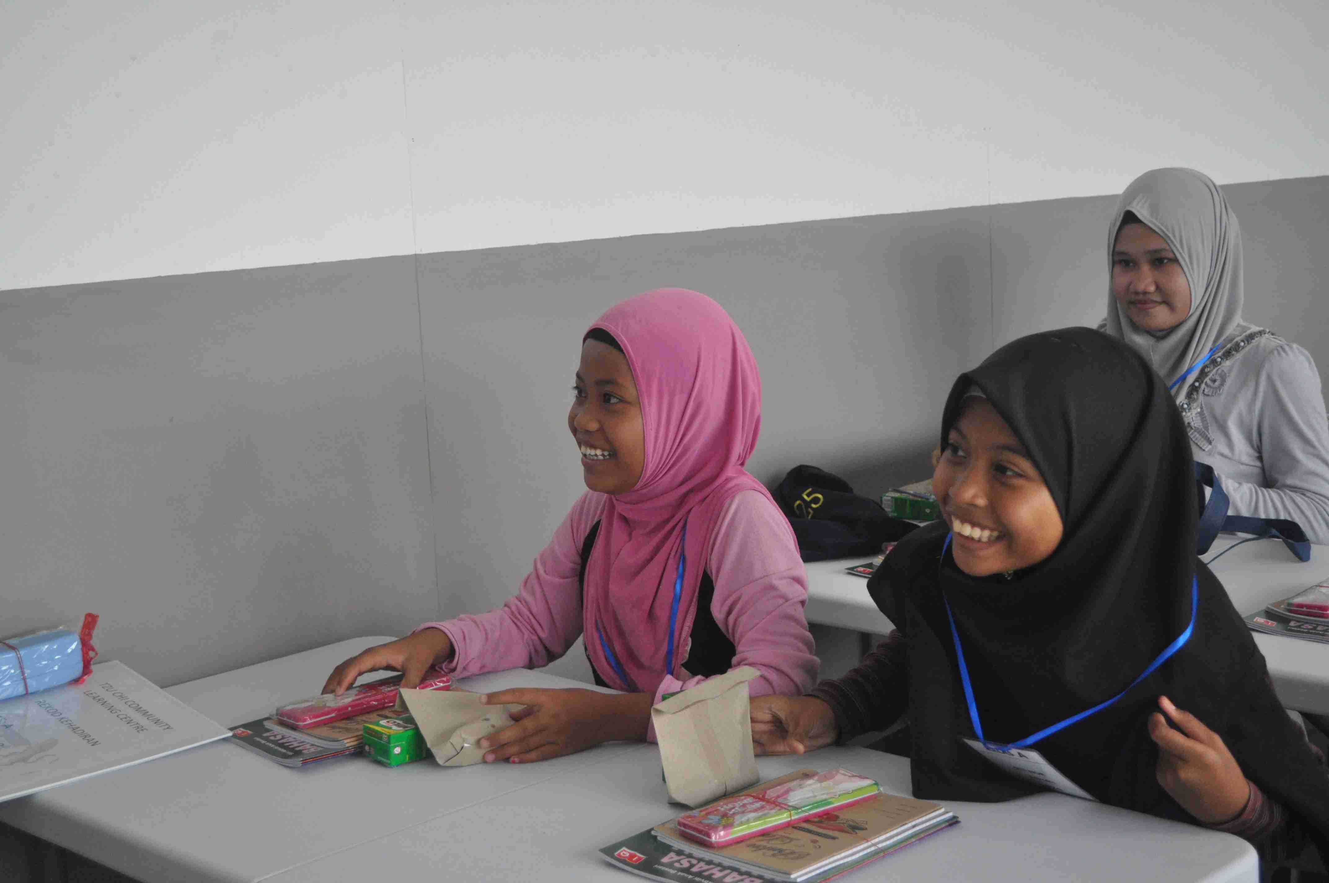 2017年3月5日的迎新会,甘榜狄丁岸历史性的一刻,小朋友一大早就和父母迫不及待在学习中心前等待。待志工把一切准备就绪后,学生依照名字的顺序一一排列好,志工贴心地为每人准备一张名牌挂于胸前。就读A班的茜蒂努爱莎(Siti Nor Aisyah)自愿协助志工把小朋友分成两组。