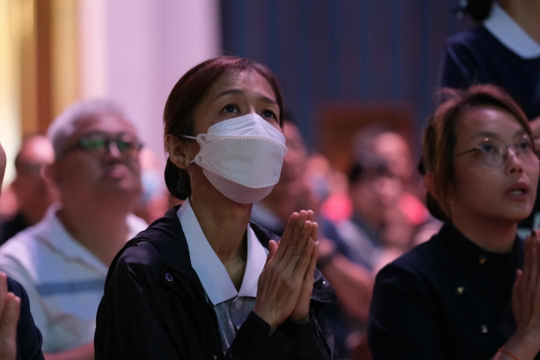 黄玉嘉(左)身子因化疗而虚弱。然而,她还是来了。因为在她心中,有一个念头比病痛更强大——要亲眼看见儿女在舞台上演绎孝道。【摄影:林振胜】