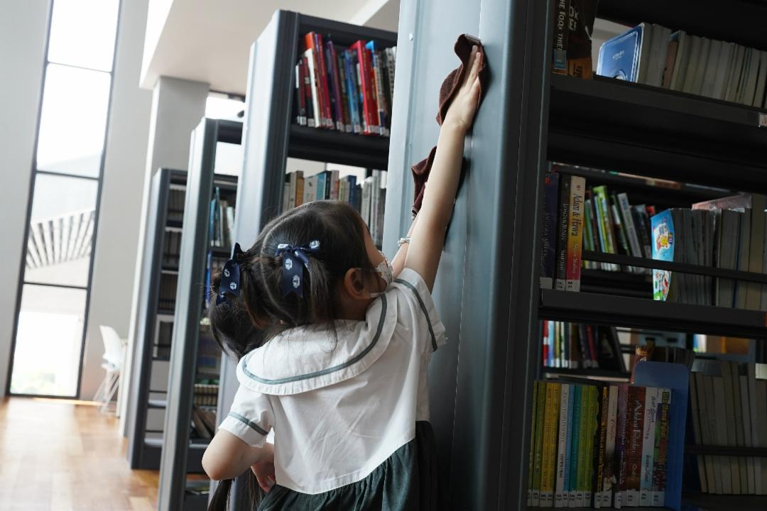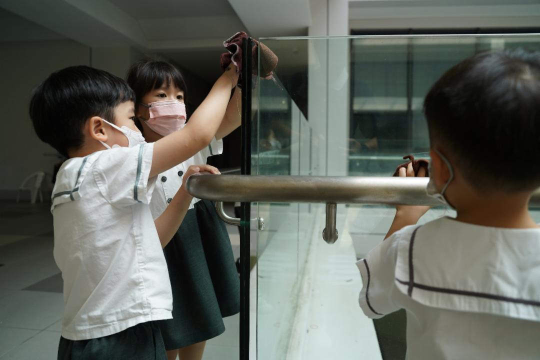 除了赠送色笔,另一个造福的时候到了。每位儿童都有造福能力,因此幼教小孩的儿童节活动之一就是校园大扫除。老师根据孩子的能力,拟定了大扫除的任务,再由班上的学生决定要执行哪一项工作,其中包括抹小白椅,抹玻璃,清理运动器材,打扫图书馆等等。