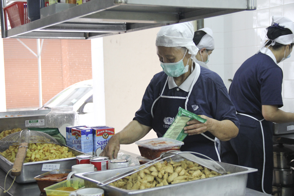 宽敞的厨房里,被分隔成左右两旁的空间。料理台前,大型容器里的马铃薯、黄瓜与红萝卜载浮载沉地躺在里头,有志工负责清洗,也有人削皮,然后切块待用;一旁的大饭锅前,志工把洗好的白米倒入饭锅中,并确保一粒米都没有被浪费掉。