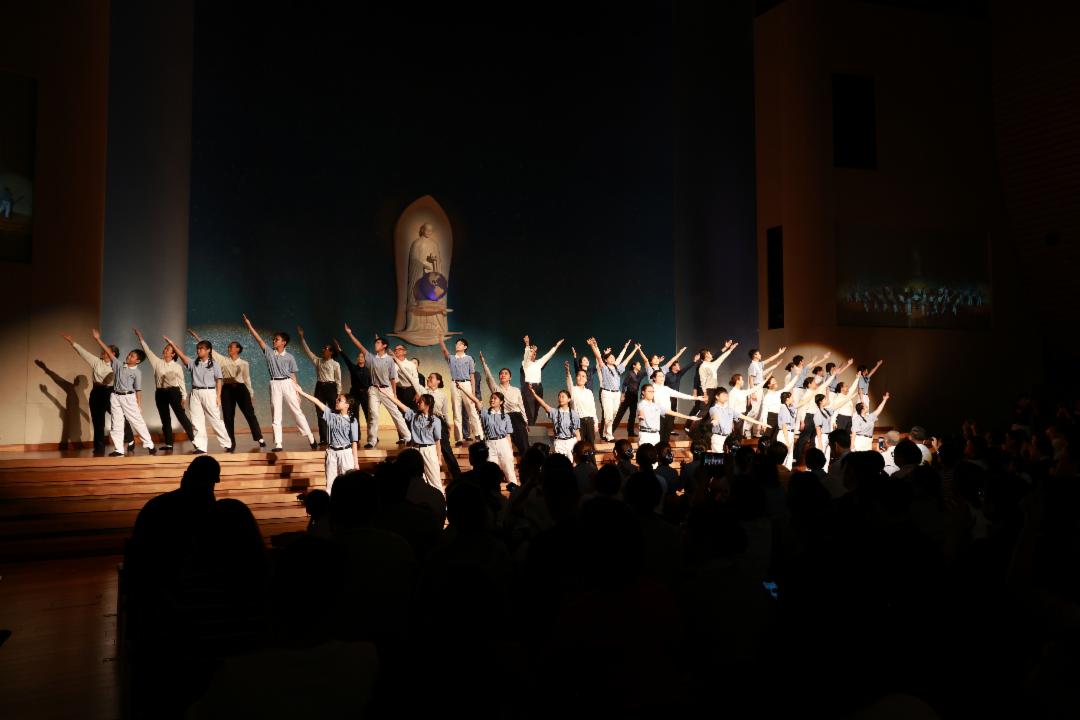 当〈报恩〉曲子的梵呗法音在感恩堂响起,舞台上四十六位大人与小孩,以流畅而虔诚的手语,演绎着父母恩情的浩瀚与难报。稳站台中央的李秀琴面带微笑,以熟练俐落的手语动作,将〈报恩〉演绎得丝丝入扣,赢得观众热烈掌声。